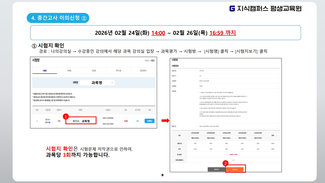 2026년 1학기 3차(12월 19일 개강반) 중간고사 일정 안내