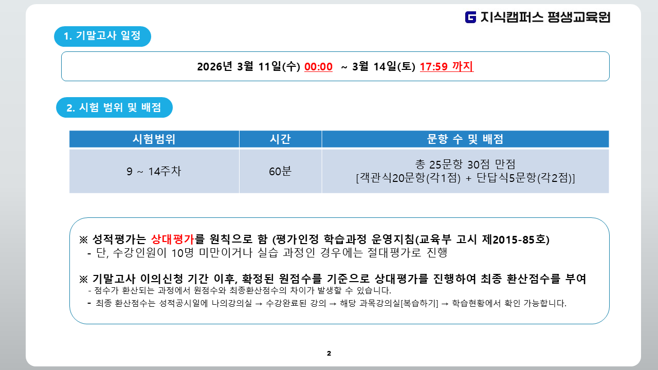 2026년 1학기 2차(12월 5일 개강반) 기말고사 일정 안내