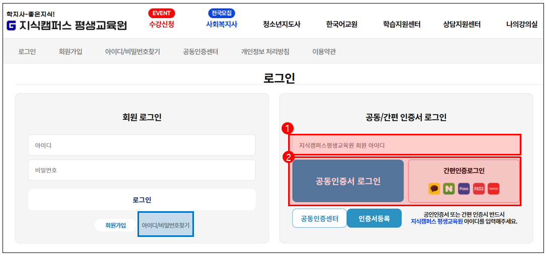 2-1. 지식캠퍼스교육원 아이디를 확인 후, 입력해주시기 바랍니다. 인증서 또는 간편인증 로그인 시, 반드시 지식캠퍼스 아이디 입력 후 로그인을 해야 합니다. 교육원 아이디를 모르시는 경우, [교육원 문의] 또는 [아이디/비밀번호 찾기]를 이용해주시기 바랍니다) 2-2. 간편인증 시, 이름과 생년월일에 공백이 없는지 확인해주시기 바랍니다.