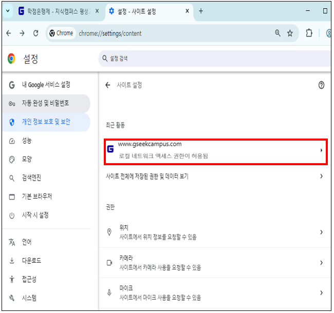 ② 화면 상단에 나타나는 '새로고침' 클릭 또는 'F5버튼' 클릭하여 새로고침 진행 2) 팝업이 나타나지 않을 경우 -2번째 방법 ① 브라우저 설정(chrome://settings/) 접속 ② '개인 정보 보호 및 보안' 클릭 ③ 사이트 설정 → 최근 활동에서 교육원 사이트 클릭 ④ '로컬 네트워크 액세스' 허용으로 변경