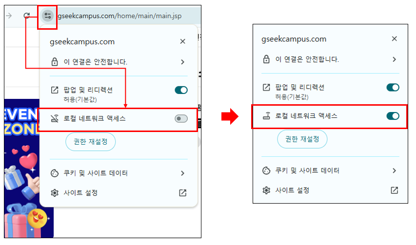 2) 팝업이 나타나지 않을 경우 -1번째 방법 ① '사이트 정보 보기' 아이콘 선택 → '로컬 네트워크 액세스' 항목을 '활성화'