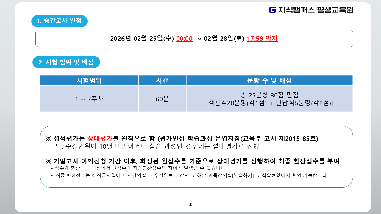 2026년 1학기 4차(1월 2일 개강반) 중간고사 일정 안내
